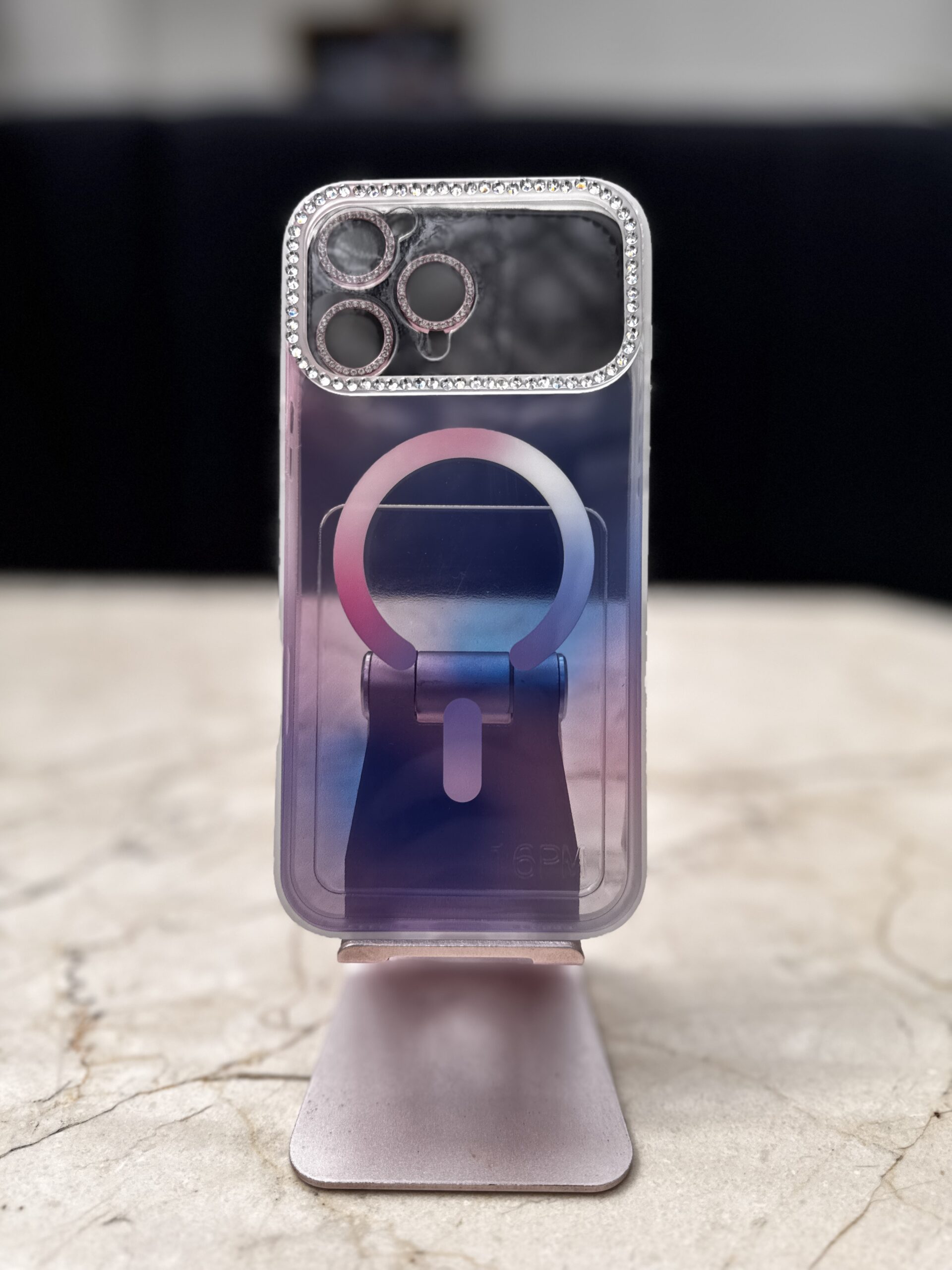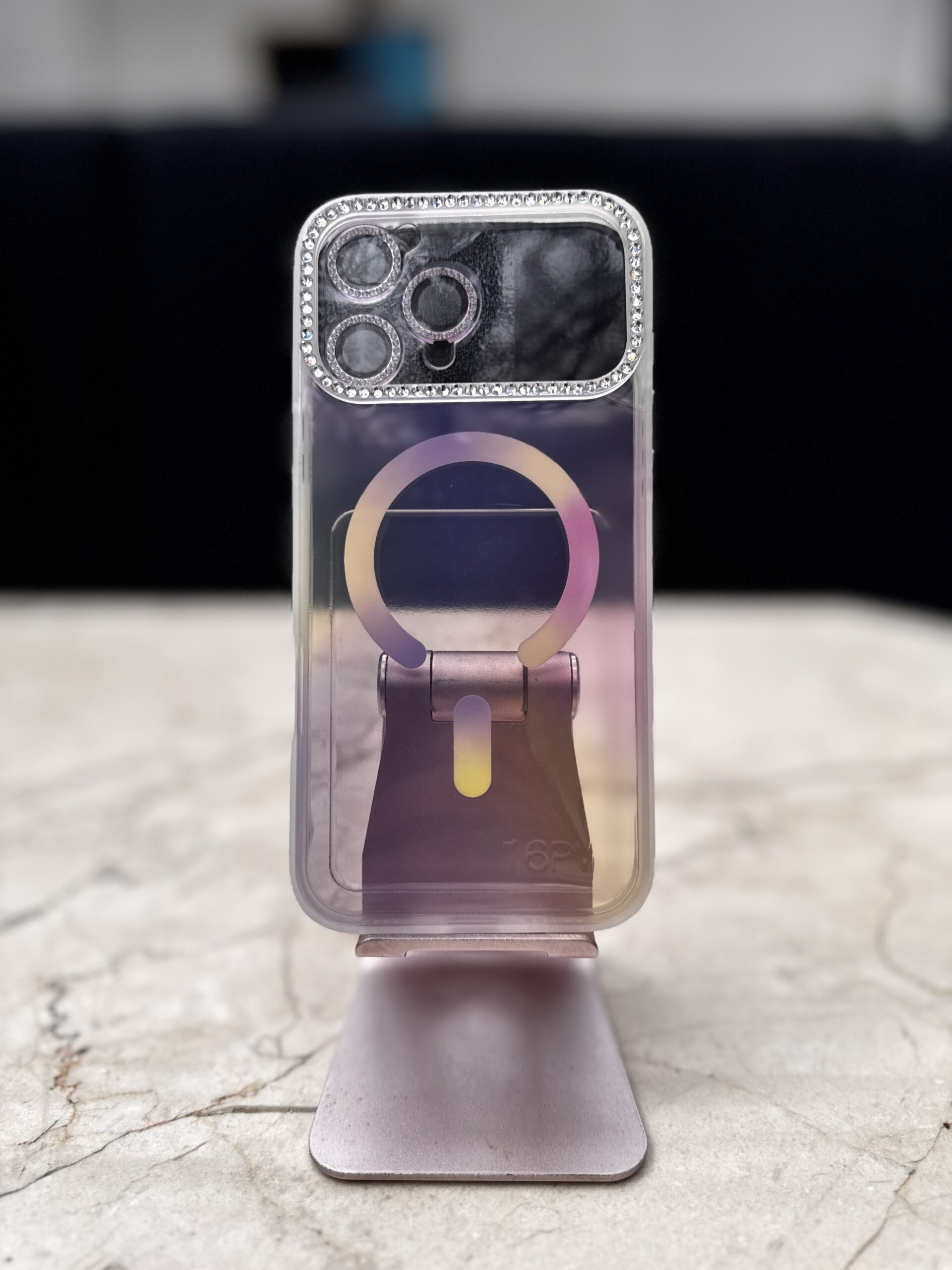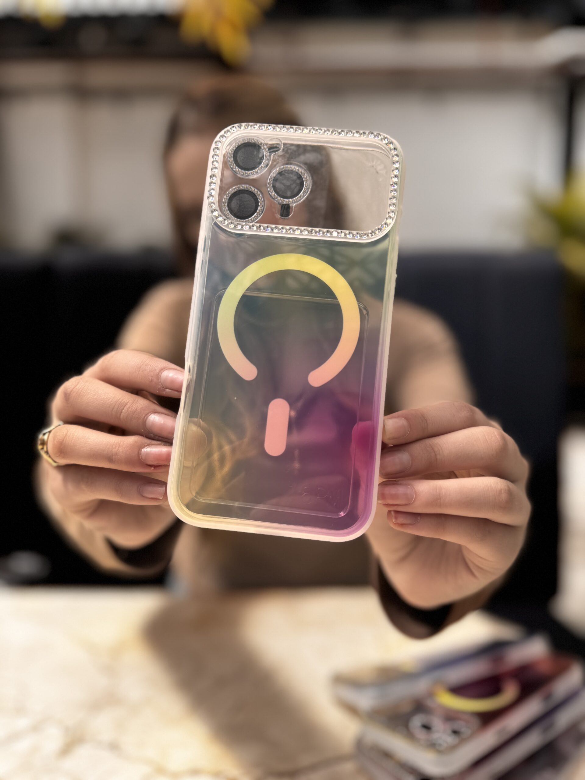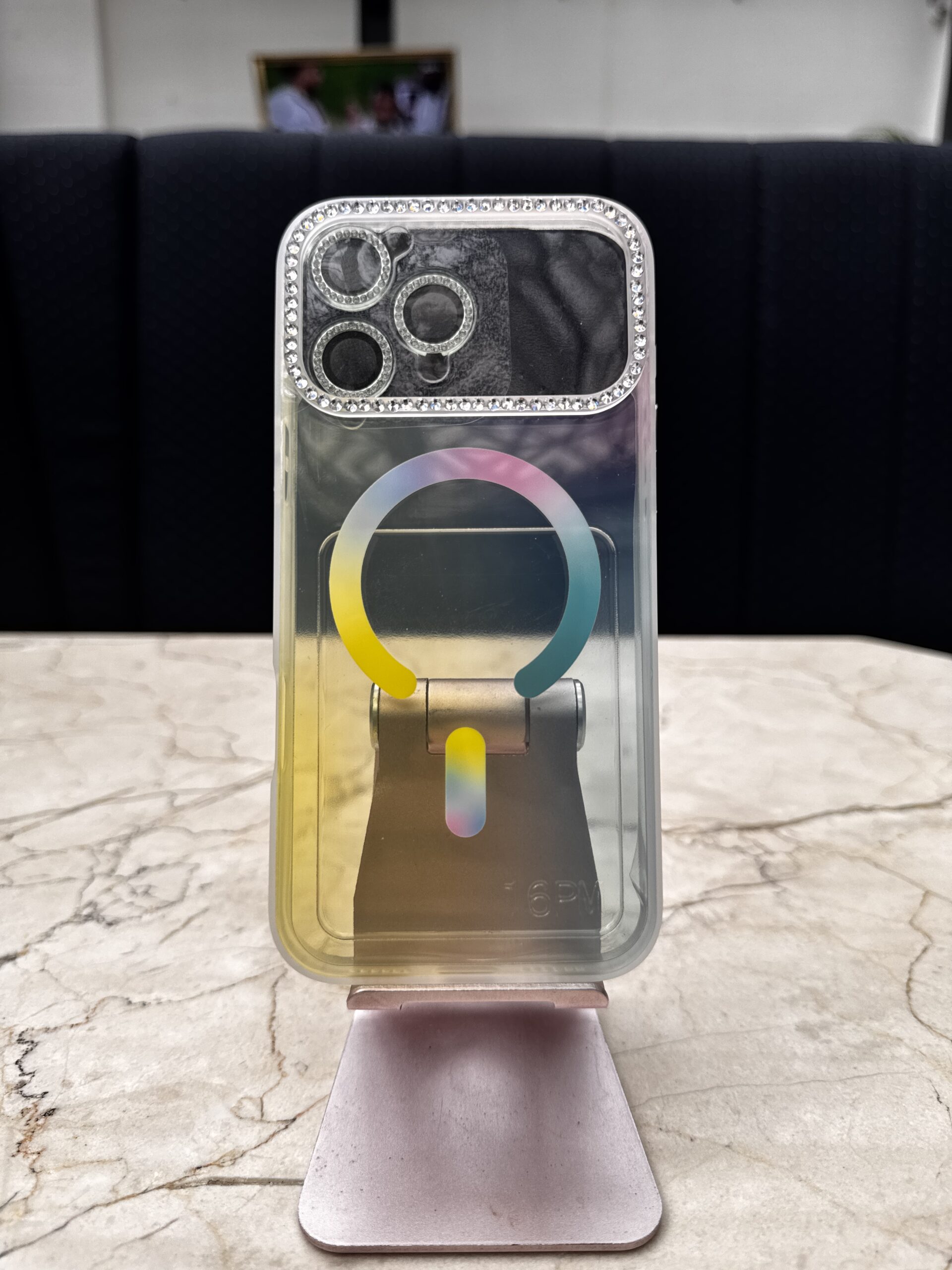 Case transparente con aro magnético tornasol compatible con MagSafe y detalle de pedrería en el marco de cámara. Fabricado en TPU resistente con bordes reforzados y protección elevada.