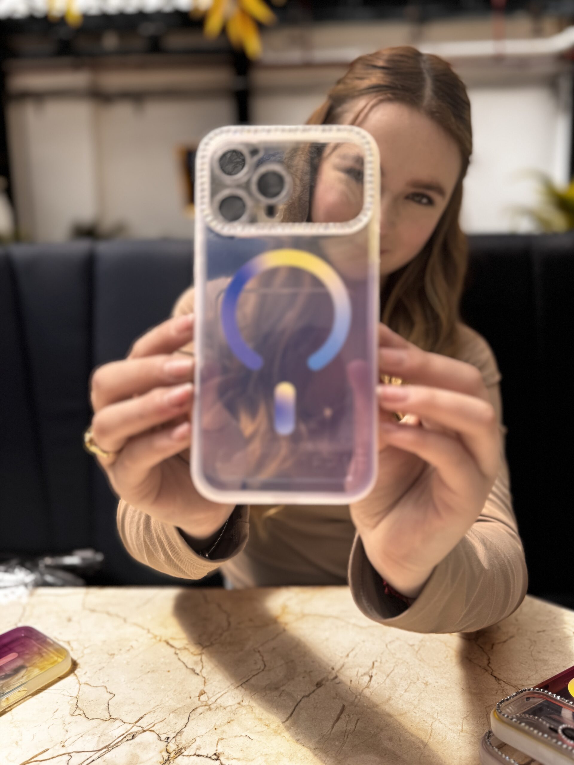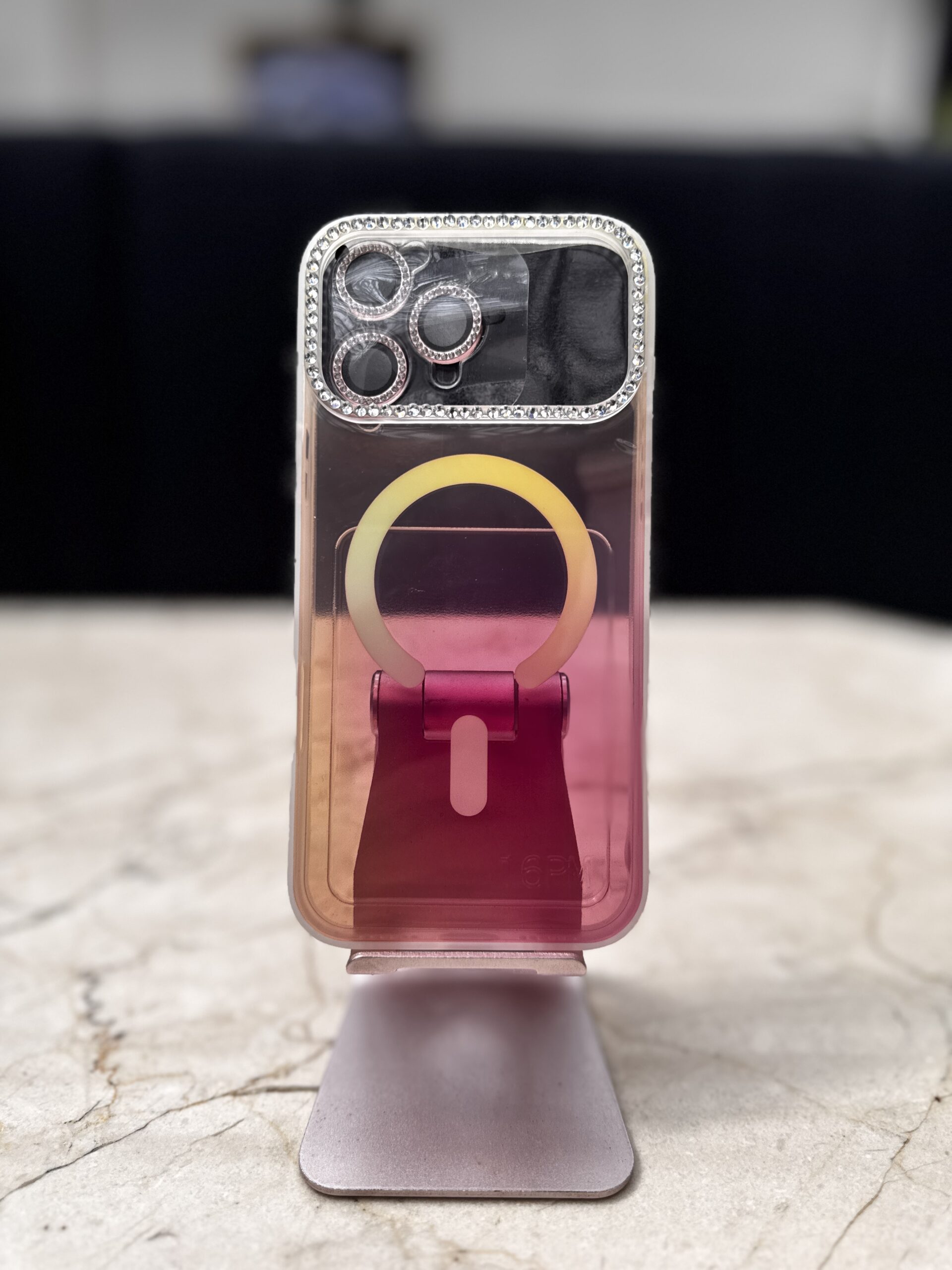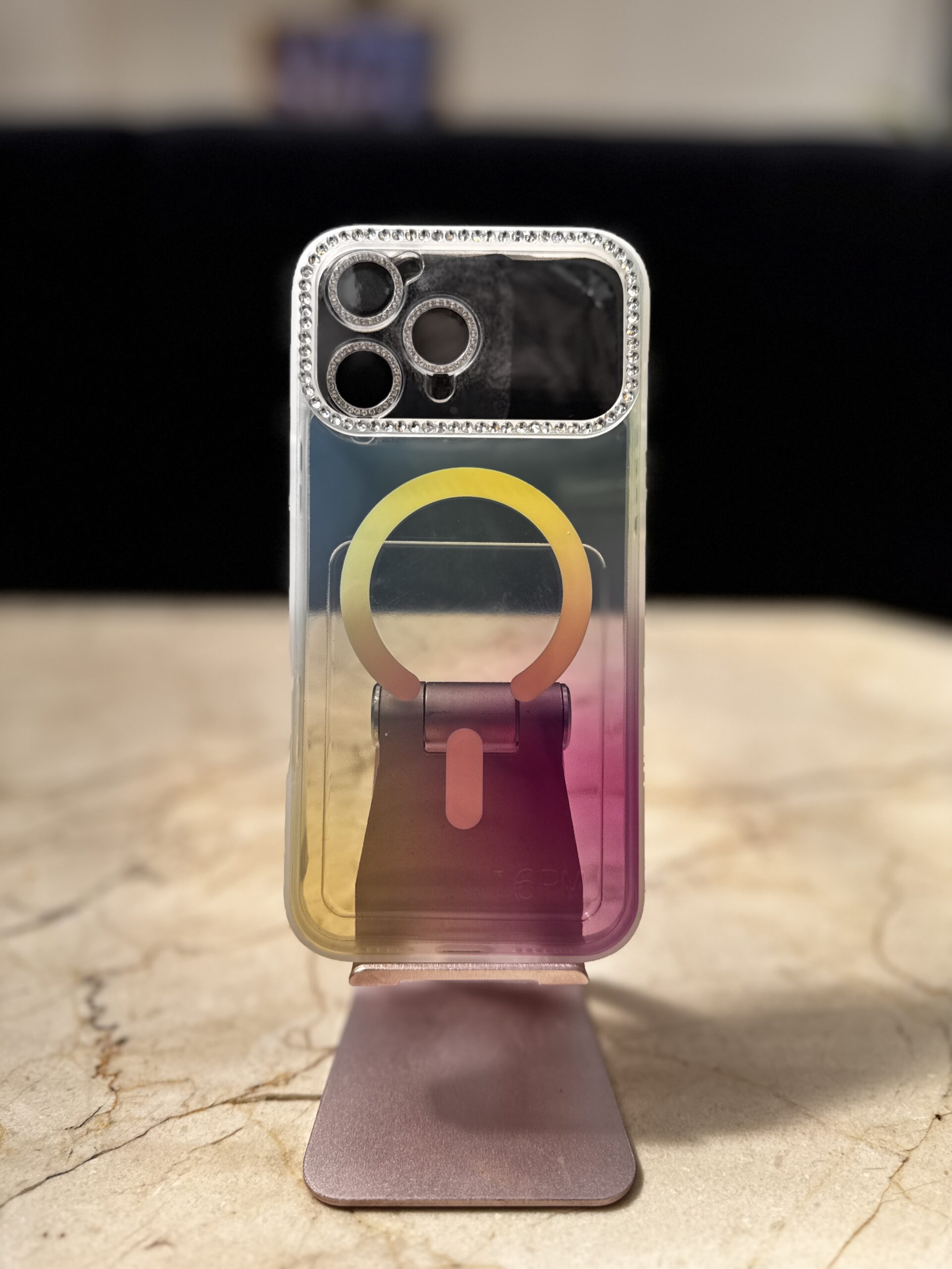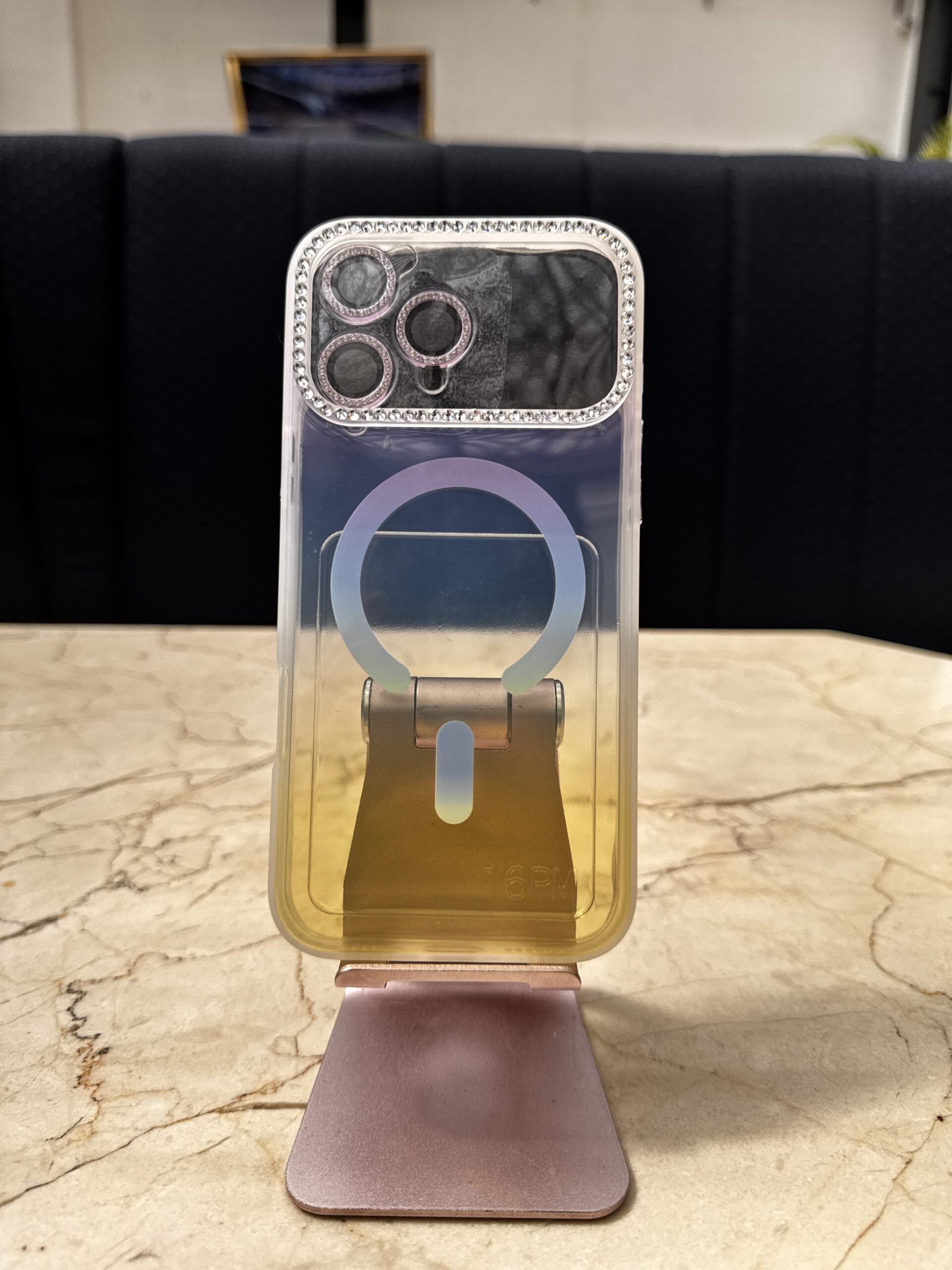 Case transparente con aro magnético tornasol compatible con MagSafe y detalle de pedrería en el marco de cámara. Fabricado en TPU resistente con bordes reforzados y protección elevada.