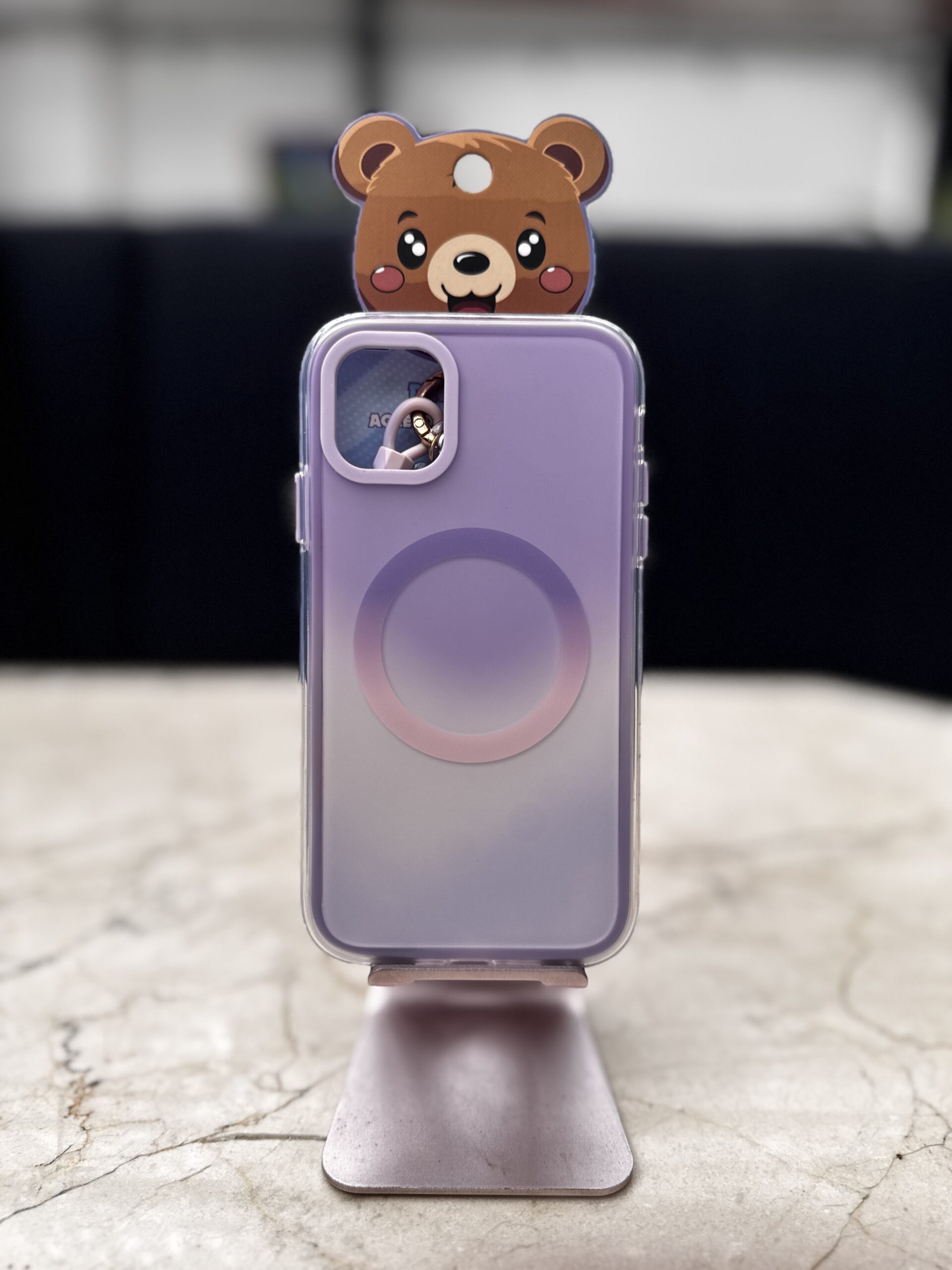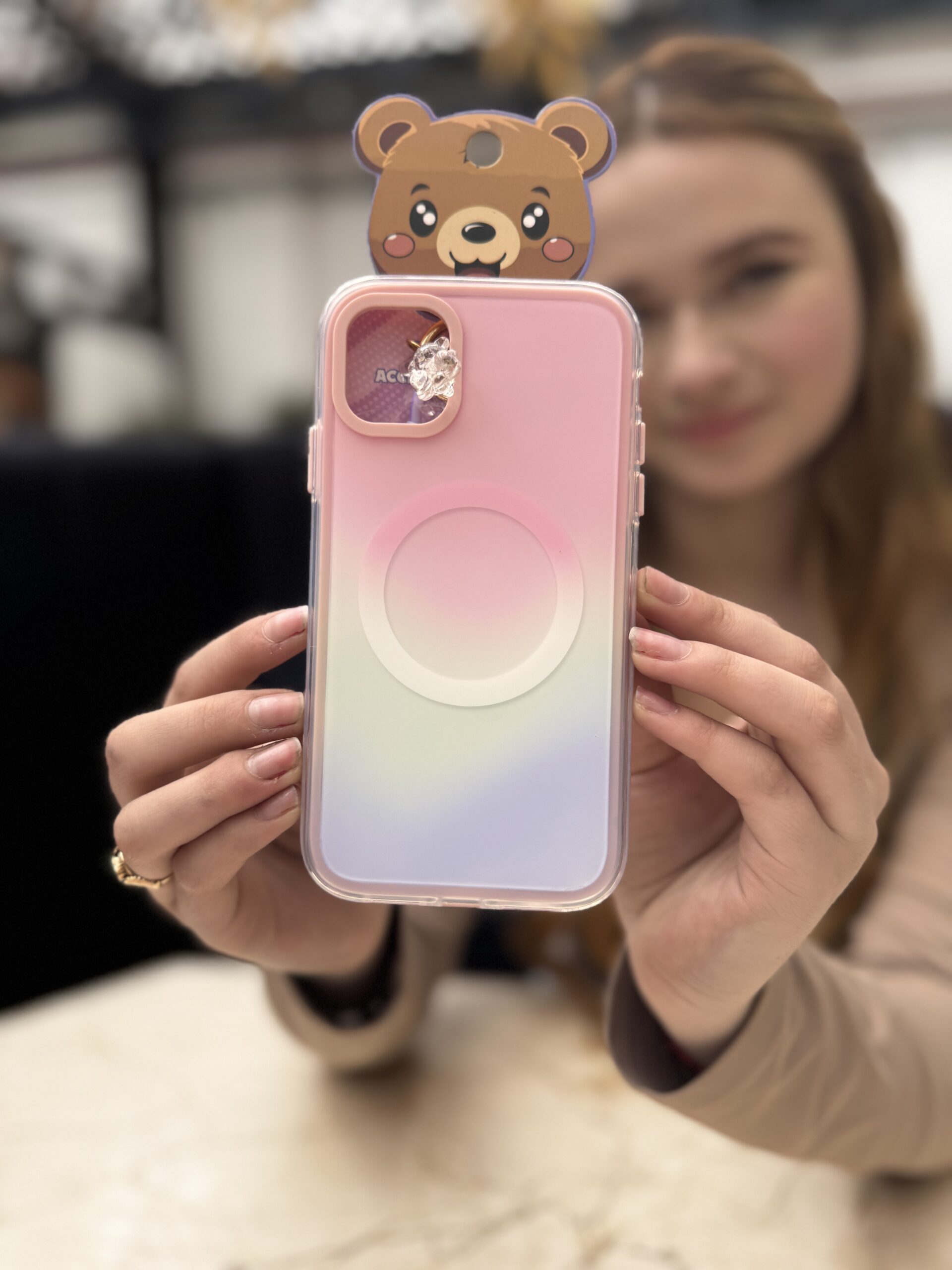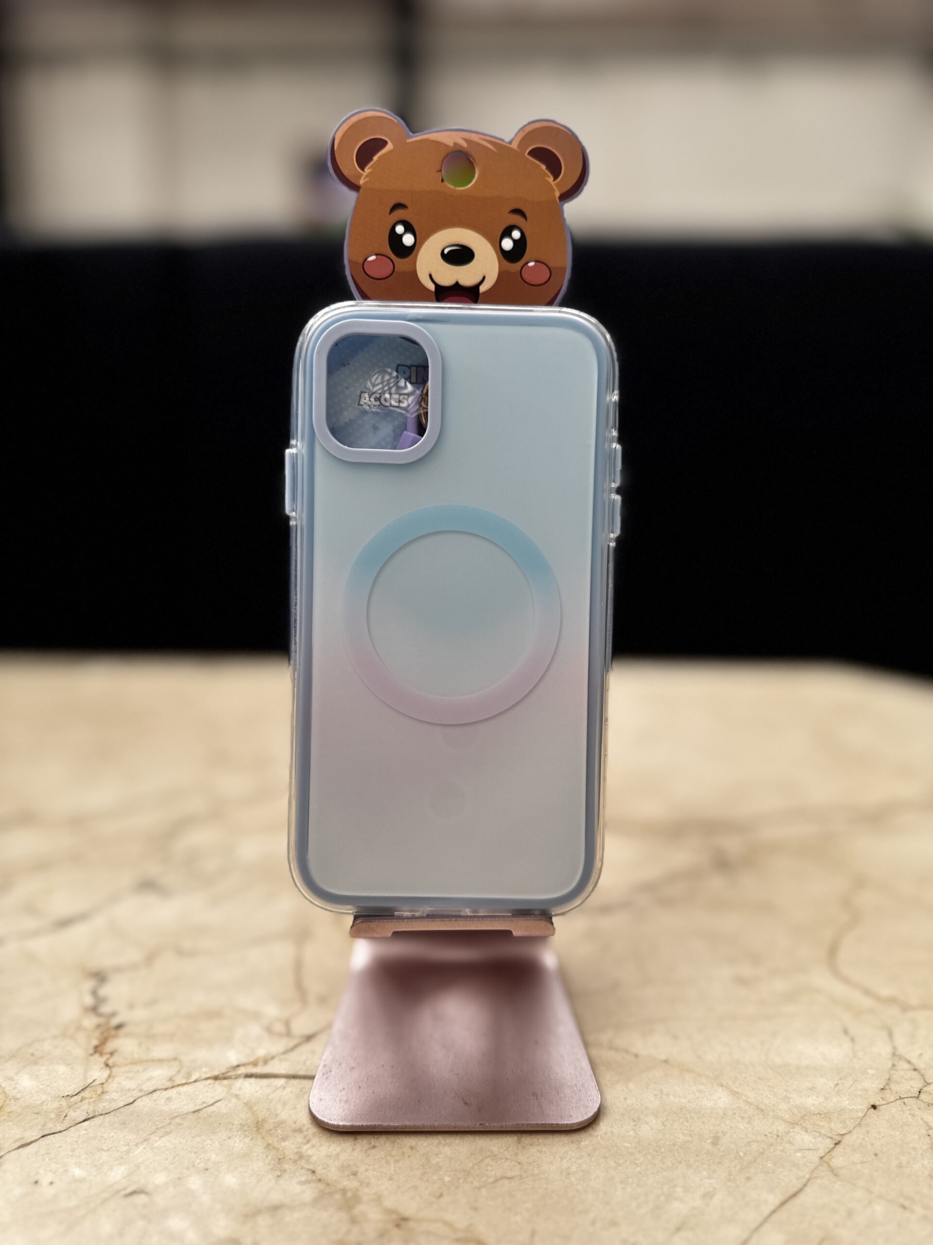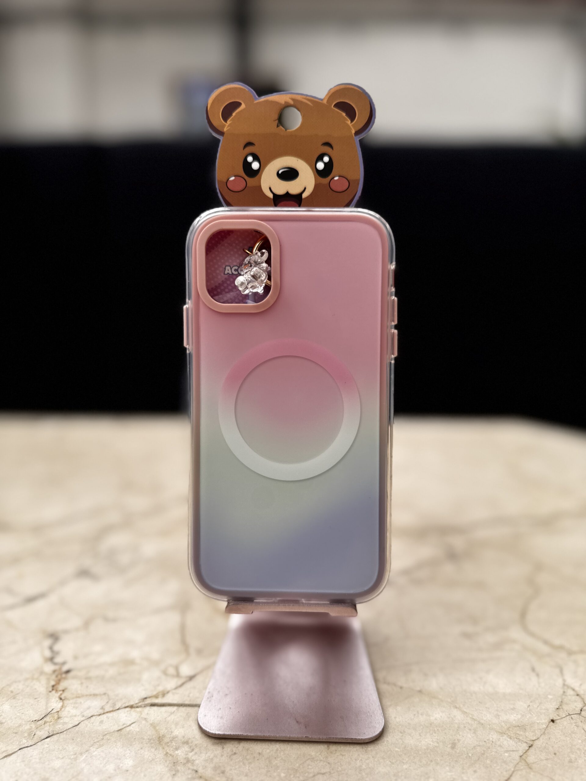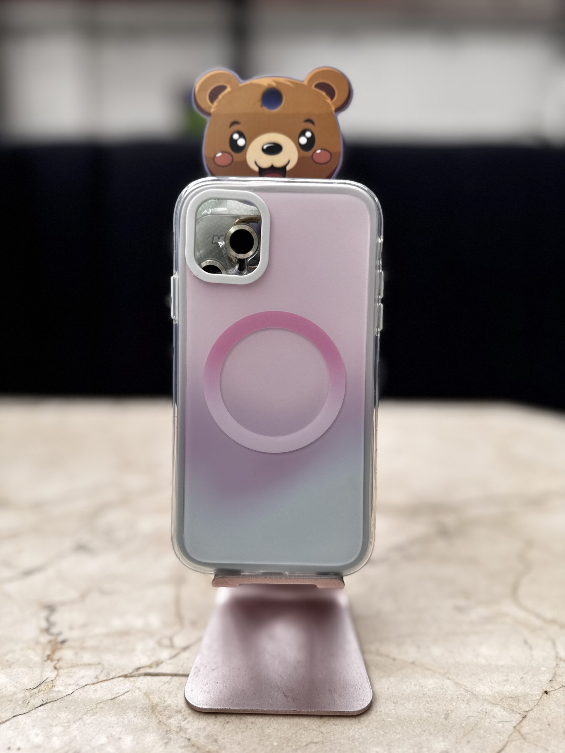 Case magnético degradado con diseño 3D de oso para iPhone. Fabricado en silicona TPU flexible y resistente, protege contra golpes y rayones sin añadir volumen. Compatible con MagSafe para carga inalámbrica y accesorios magnéticos. Acabado mate en tonos pastel con bordes elevados para mayor protección de la cámara. Ideal si buscas una funda para iPhone original, segura y con estilo kawaii.